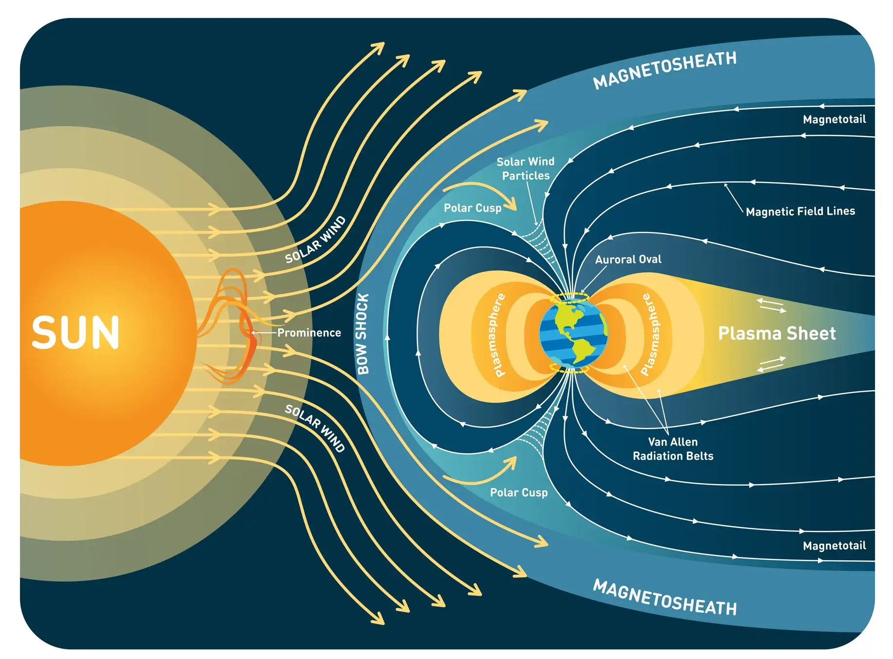 Heldigvis har Jorden sit magnetfelt – også kendt som magnetosfæren. Det beskytter vores planet mod solvindens barske stråling. Det opfanger også nogle af solvindens partikler og accelererer dem op til utrolige energiniveauer.