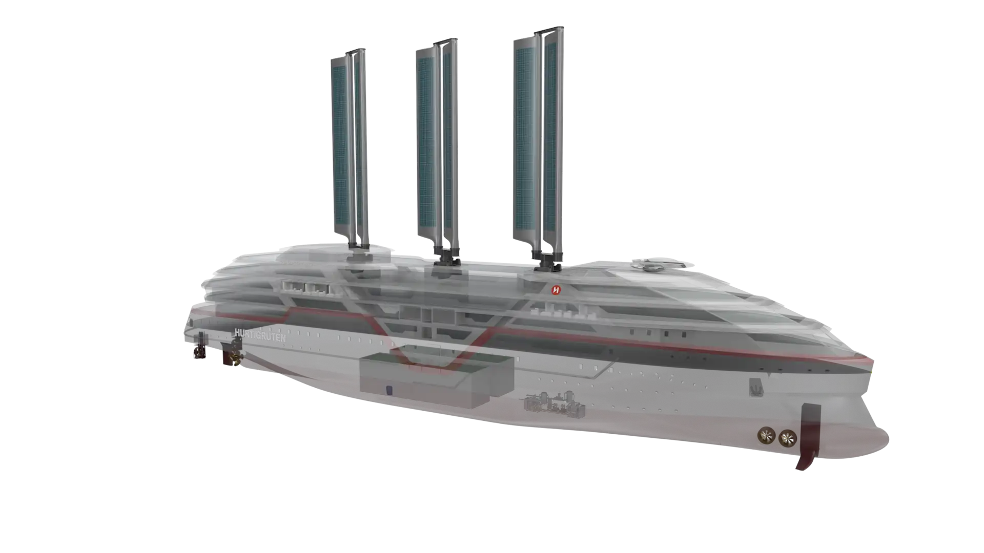 Three retractable, autonomous wing-rigs will enhance the aerodynamics of the ship, pulling in air currents up to a height of 164 feet for added propulsion. These sails will also be covered in solar panels for a total surface area of over 16,000 sq ft.