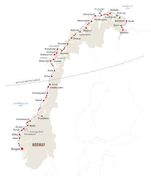 Our signature voyage along the Norwegian coast travels from the southern city of Bergen, across the Arctic Circle, up to Kirkenes, and back. These 12 days and 2,500 nautical miles feature some of the most stunning scenery on the planet.