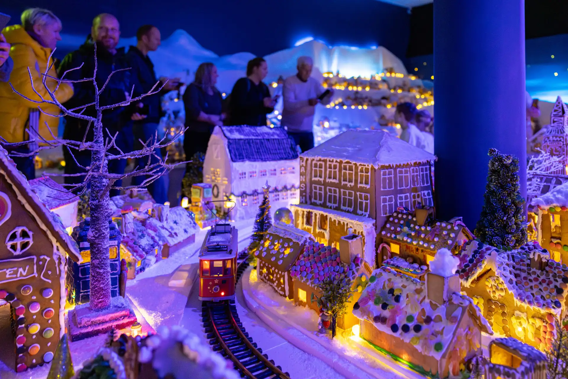 The first thing that strikes me as I walk into Pepperkakebyen is the scent, all pine trees and spices. The next is the light. At Pepperkakebyen’s heart is an enormous room illuminated by a blue light like the Polar Night. It’s filled with gingerbread houses twinkling with fairy lights.