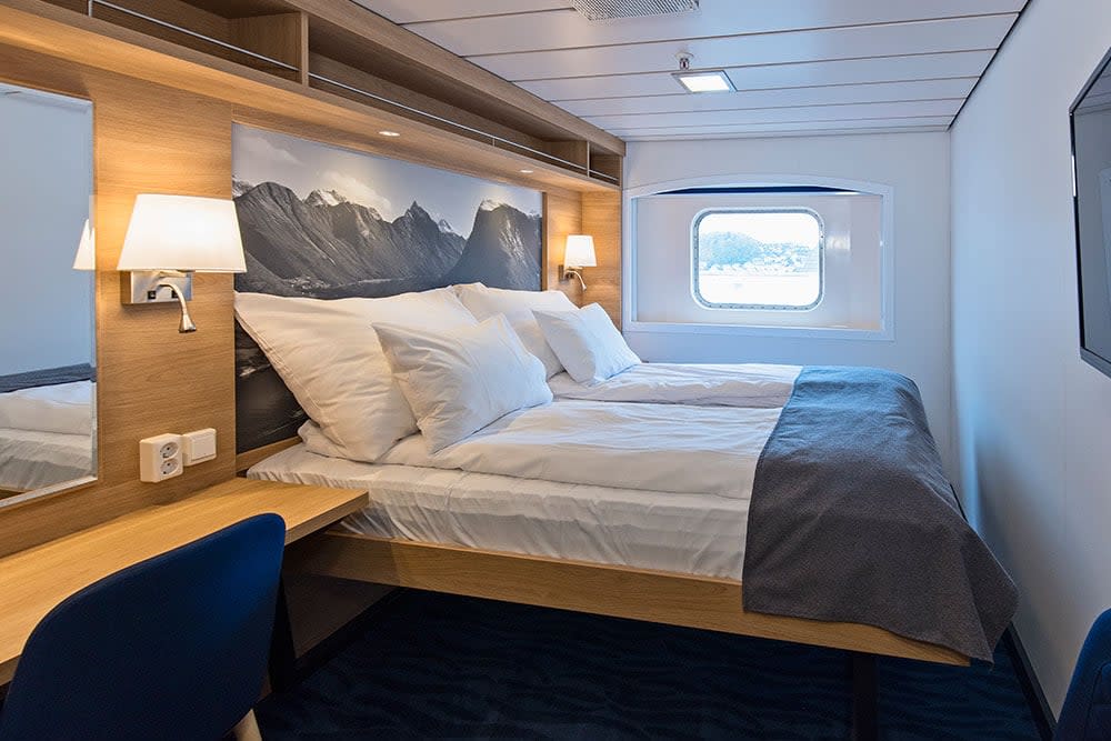MS Kong Harald has 218 cabins, including 2 suites, and carries a maximum of 577 guests.